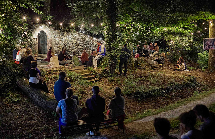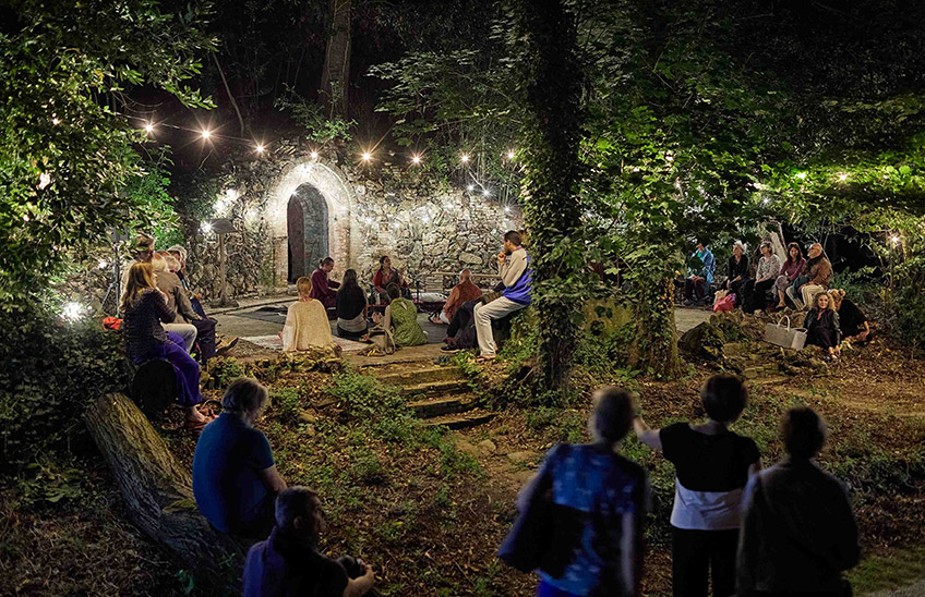 Togliersi le scarpe e riconquistare il contatto con la terra: ecco, forse per trovare il proprio posto nel mondo è necessario lavorare per sottrazione. È il cuore di A piedi nudi sulla terra, il libro di Folco Terzani che racconta l’incontro e la vita straordinaria dell’asceta italiano Baba Cesare, e che in una germogliazione a catena ha condotto all’audiolibro affidato alla ricerca vocale di Elio Germano e alla ricostruzione di un evocativo mondo sonoro, fino a questa installazione che trasporta il pubblico in una dimensione altra. Nel parco della settecentesca villa Masini, per tutta la notte, in una sorta di santuario temporaneo ispirato alla grotta del Sadhu indiano, attorno al fuoco sacro (dhuni), si può sostare, ascoltare, osservare, mentre un vero “cela” (discepolo del Sadhu) officia i riti dell’asram, offrendo chai e cibo, in silenzio, come da tradizione. Del tutto liberi, anche da scarpe e telefoni.