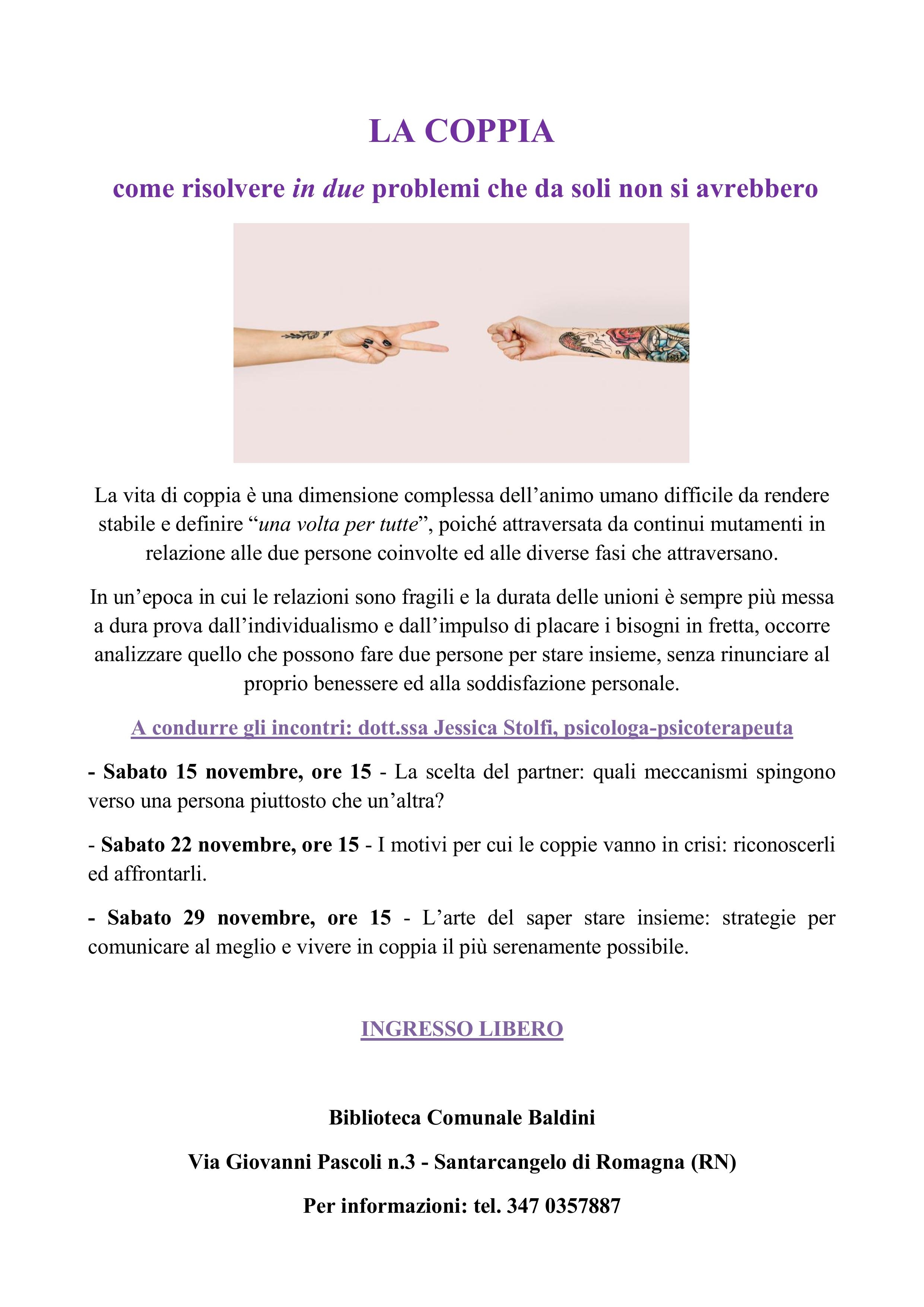 Ciclo di incontri gratuiti sul come affrontare i problemi di coppia a cura della dott.ssa Jessica Stolfi, psicologa e psicoterapeuta.