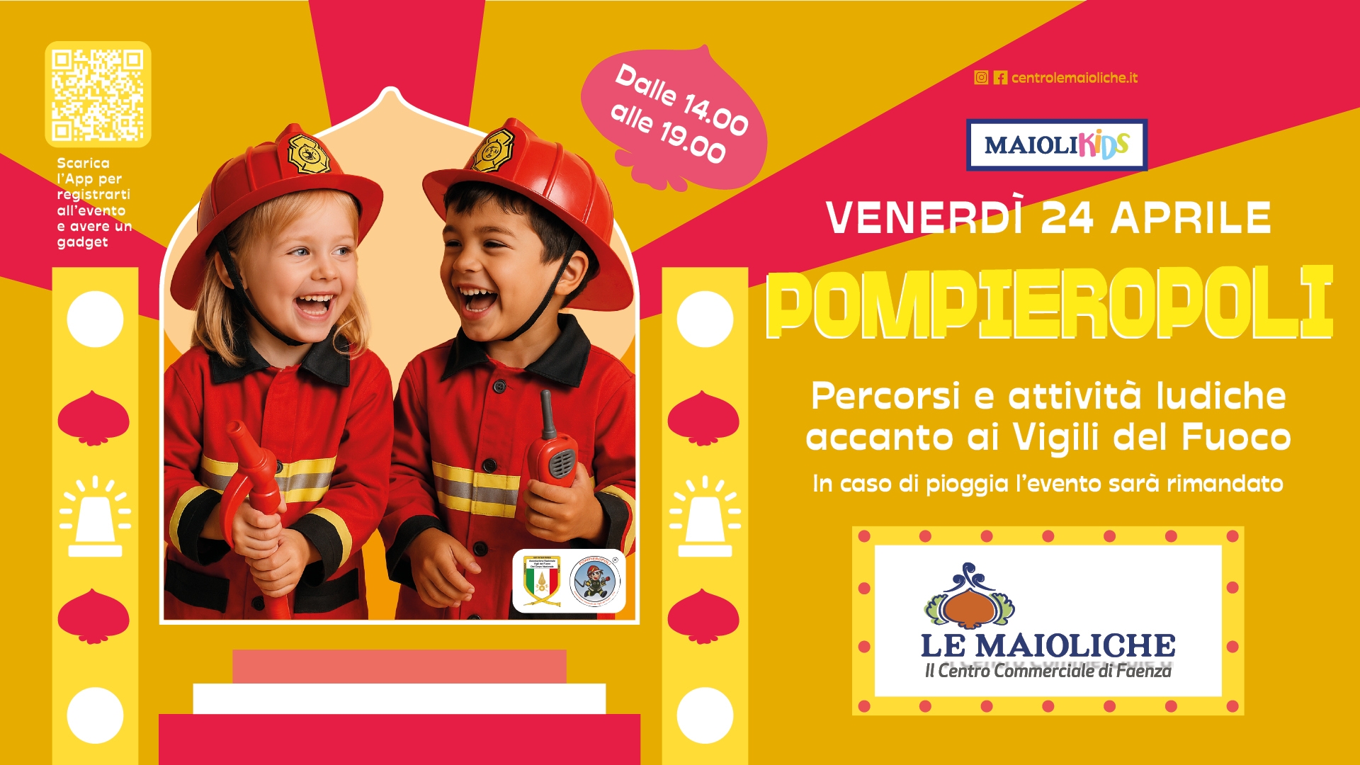 Venerdì 24 aprile Le Maioliche di Faenza arriva Pompieropoli, l’evento dedicato ai più piccoli che trasforma il pomeriggio in un’esperienza piena di gioco, movimento e divertimento. Dalle 14.00 alle 19.00 i bambini potranno partecipare a percorsi e attività ludiche accanto ai Vigili del Fuoco, vivendo un’avventura speciale pensata per divertirsi e mettersi alla prova.